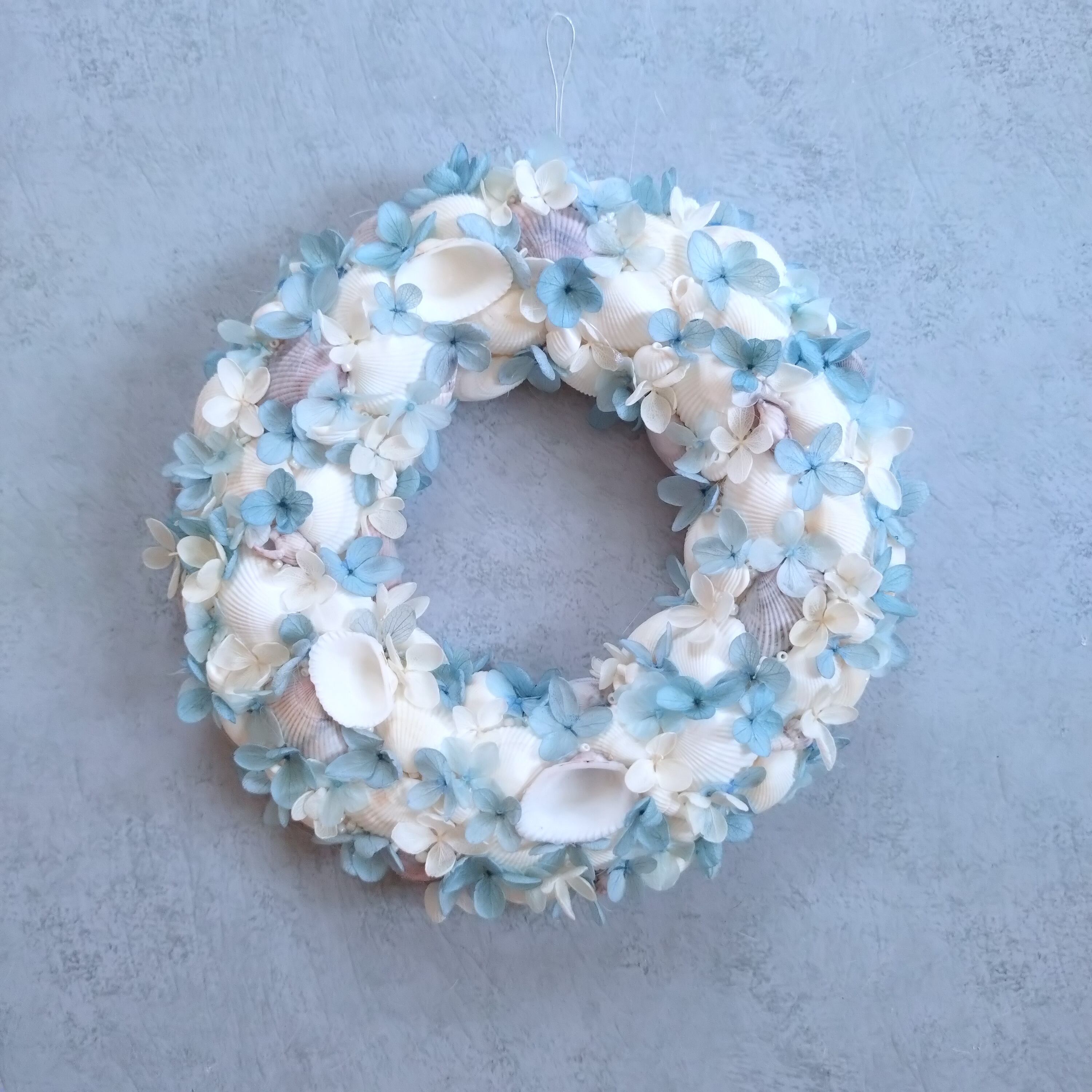 プリザーブドのブルーホワイトのアジサイとシェルとビーズが
