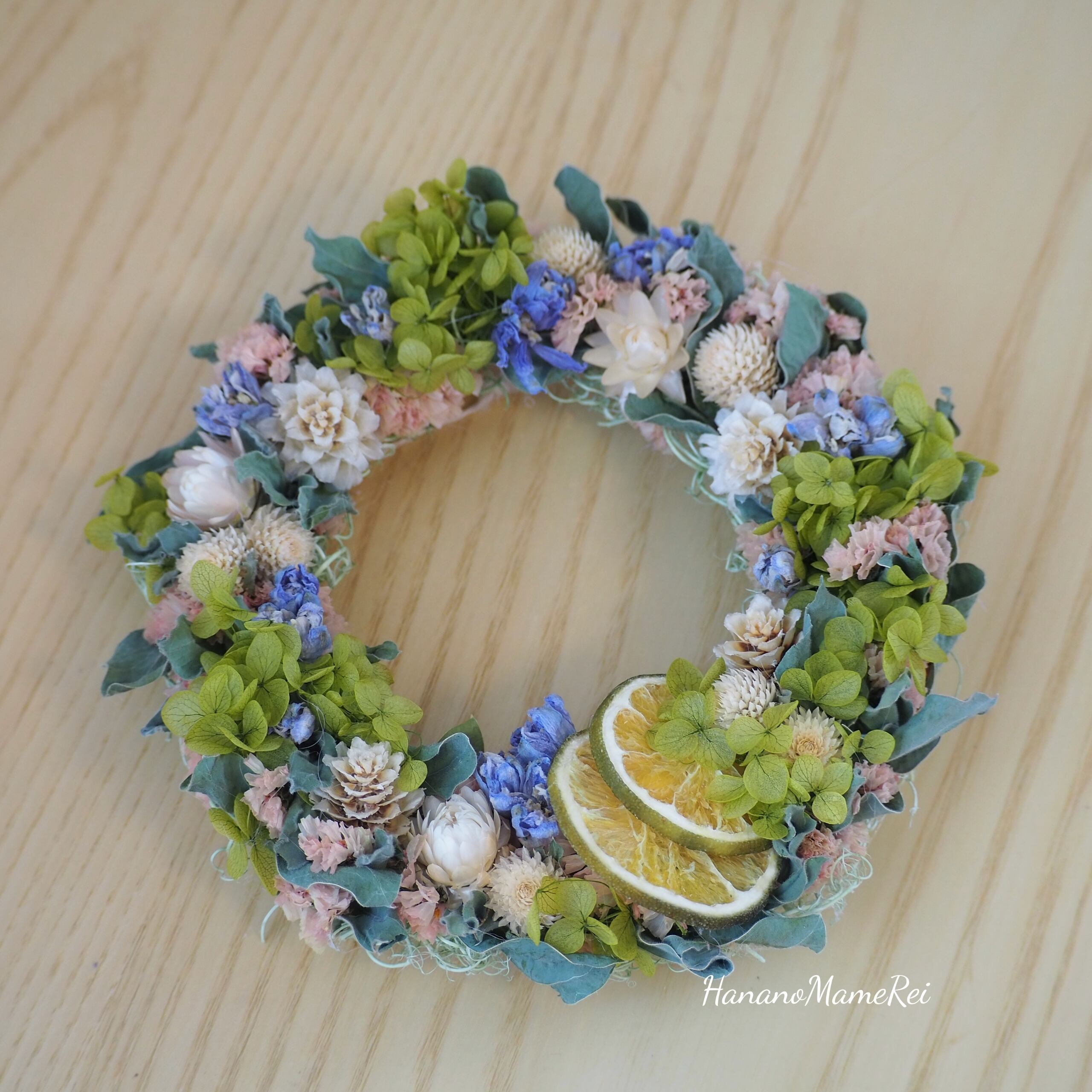 ドライフラワーのデルフィニウム、スターチス、千日紅などが入った小さめのリースです。
