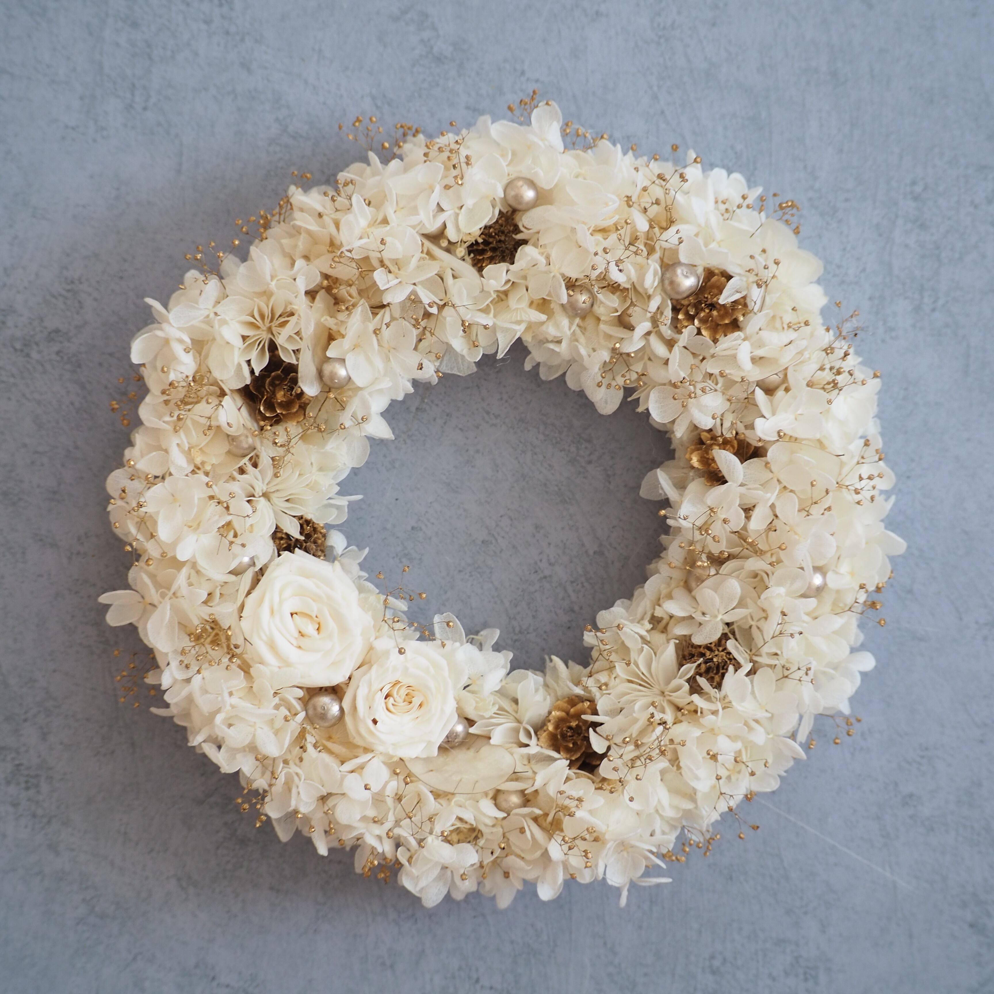 プリザーブドのホワイトローズとアジサイ、かすみ草、ゴールドカラーのサンキライ、木の実などでお作した上品なリースです。