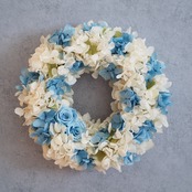 ホワイトとブルーのお花で優しく癒されるようなリースです。